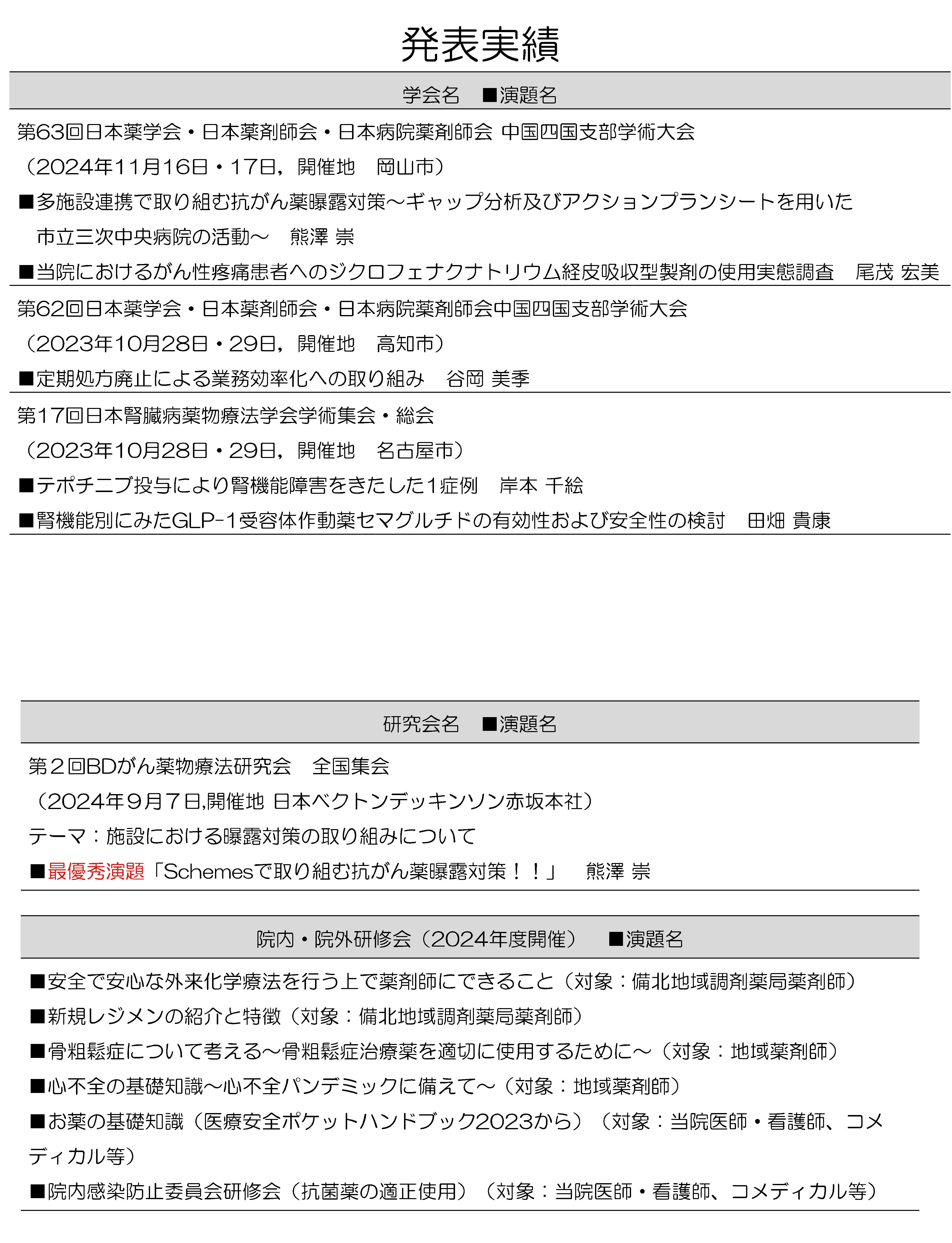 また、専門知識を活かすべく、学会発表、地域の薬剤師や院内の多職種対象に研修会を行っています。